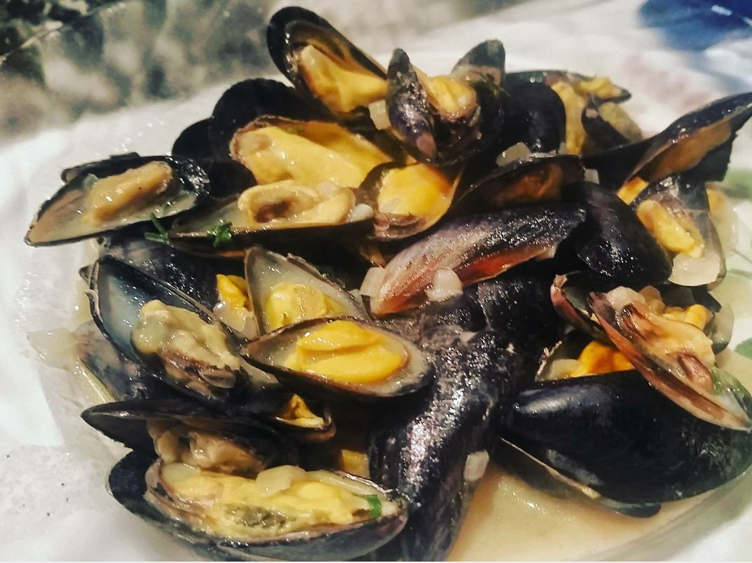 mussels, which required picking the algae off the shells and ensuring that none of them were open. I cut the scallions for the sauce, and then my host took care of the rest, so I unfortunately cannot retell the recipe. But I will say that the buttery fish melts on the tongue with unparalleled pride– a true cause for celebration. Finally, I ate the highly-esteemed Coquilles Saint-Jacques. The scallops were served with a small portion of rice and swathed in a blanket of rich, warm sauce not unlike the one served with the mussels.
